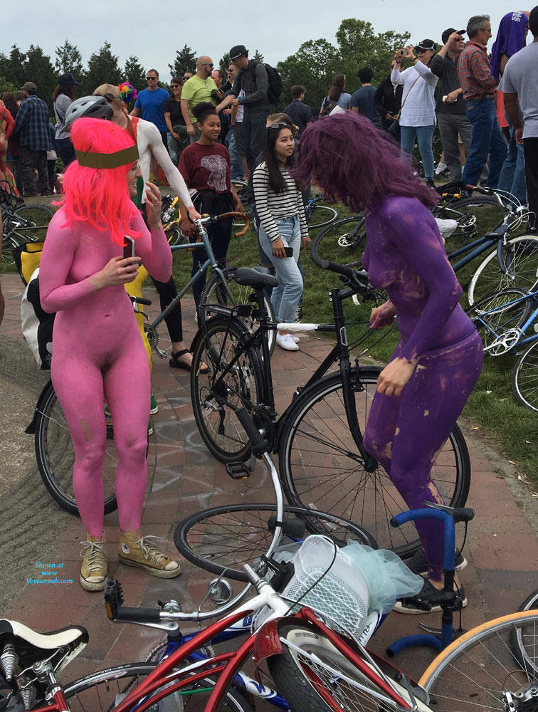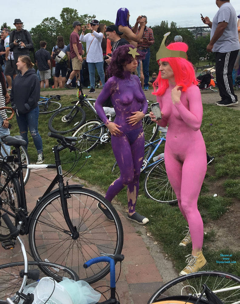 Respect to the woman in pink paint for her integrity and self-confidence in omitting bikini bottoms. I wish the black (?) woman and the Asian woman in the center of the second picture had had enough self-confidence to go nude as well. Yes!