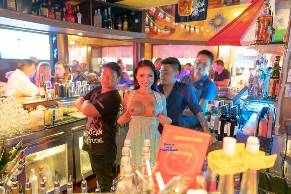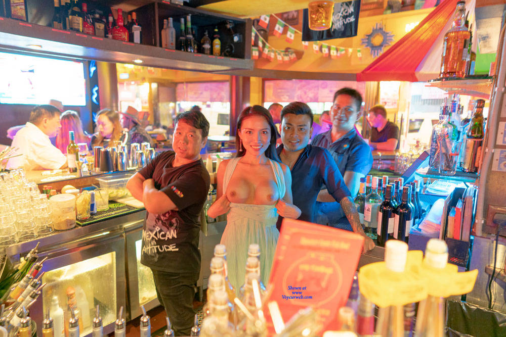 Hi everyone, My BF and I had a layover in Hong Kong and we decided to have some Mexican food. Of course I had to do some pussy flashing as usual. We ate in the first restaurant, but the staff wasn't that fun and just watched as we took pics. The second restaurant that we went to have margaritas and mojitos afterwards was totally different, though. The staff wanted to get involved in the photos. Unfortunately they kept moving, we were buzzed, it was dark and we didn't have a flash. so the pics turned out blurry. :( Hope you like them anyway when you see how many guys were up close checking out my tits and pussy. :P And I also found a missing pic from our Koh Samui vacation that I added in. :) Kisses & hugs, Jennifer Q