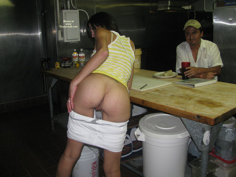 While in Palm Springs we went to a little restaurant that was recommended by the hotel. It was a Sunday and they were pretty slow so we decided to have a little fun. Once her tits were out we noticed the chef was peeking around the corner so we decided to give him a personal show. Hope you enjoy!