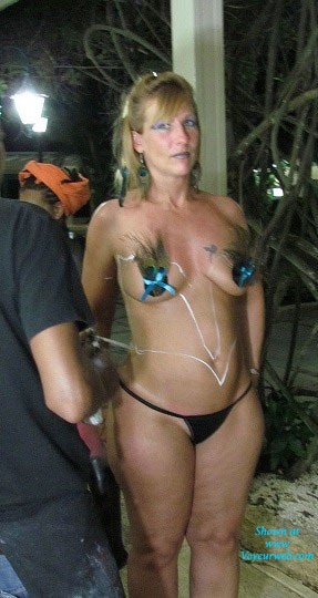 Our 1st trip to Hedonism II and on our 1st night, she got body painted to complete her Peacock themed pasties, G-string, earrings and hair extension! She got 2nd place in the contest - PLEASE vote SUPERB and help her win FIRST place!