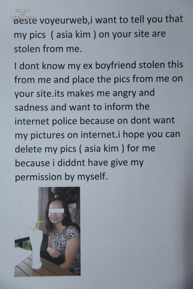 i have send you many times mails about this but never a answer back so i hope you can delete it very soon,i have added a picture from me so you can see its me. i schock other people told me i stay nude on internet,so i go control and see myself. please delete all the pics under the name ,,,asia kim ,,,please and iam very gratefull